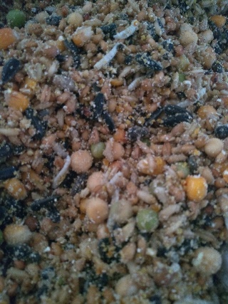 Carne. Io preferisco usare il petto di tacchino, piuttosto che di pollo, in quanto più magro. Alcuni usano anche i colli di gallina lessati e frullati, ma io preferisco il petto di tacchino tagliato a fettine e cotto alla piastra, senza sale. Successivamente lo frullo e lo surgelo così è molto pratico da usare: ne basterà un paio di cucchiai per Kg di semi ammollati per aumentare notevolmente le proteine; è molto gradito a numerose specie.